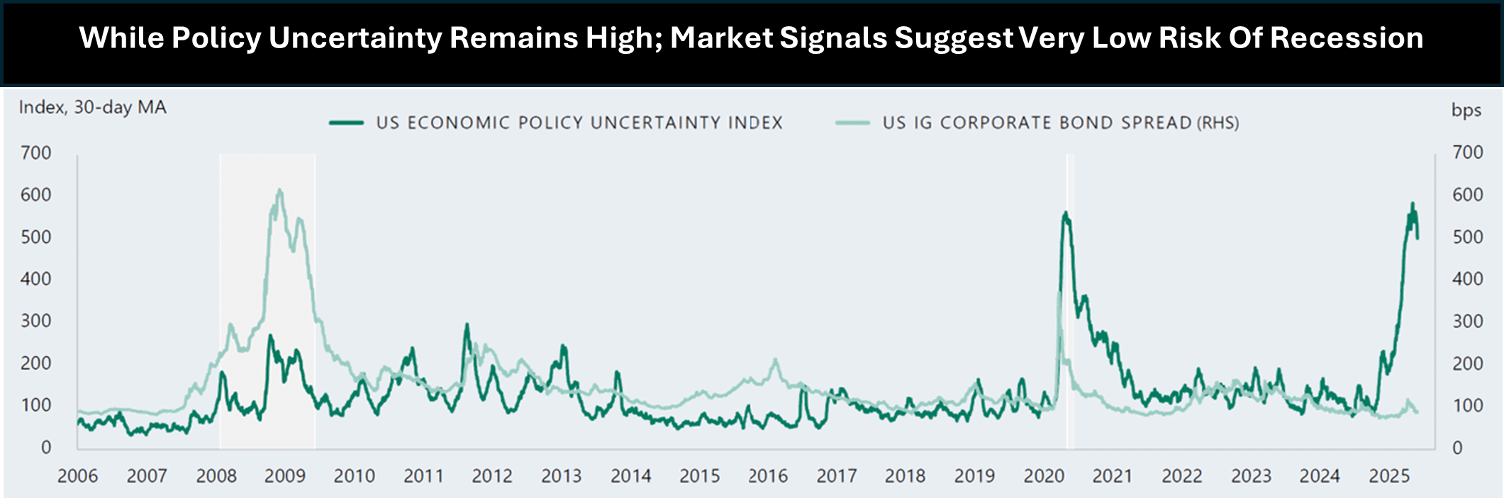 Chart: Markets have priced in a lower probability of near-term recession following policy de-escalation. Slower but steady growth is expected to persist into 2026, supported by AI-linked investment and fiscal stimulus. Source: Apollo, as of June 2025.
